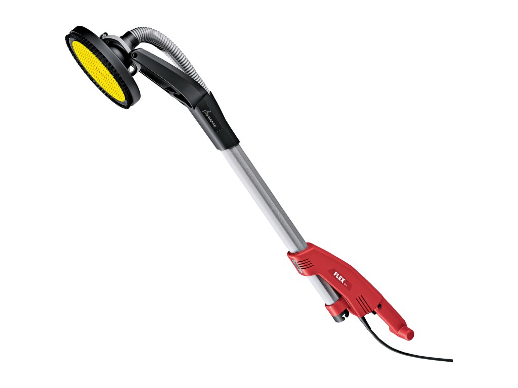Bruska na stěny a stropy Giraffe®, Velice dobře uchopitelný, lehký stroj s optimalizovaným komfortem pro obsluhu. Umožňuje neúnavnou práci a ergonomické držení, Snadné vedení: díky optimálnímu vyvážení mezi motorem a brusnou hlavou, Spolehlivý přenos síly flexibilní pohonnou hřídelí od motoru na unášecí talíř. Již několik desetiletí je toto osvědčená „FLEX technologie“. Pomocí tohoto principu konstrukce dochází k redukování hmotnosti na hlavě žirafy na minimum. To usnadňuje manipulaci, Elektronika: s konstantním udržováním otáček, pozvolným rozběhem, ochranou proti přetížení a předvolbou otáček potenciometrem, Efektivní odsávání mezi kartáčovým lemem a brousícím talířem zabraňuje zanášení brusiva a zaručuje bezprašnou práci, Možnost napojení FLEX bezpečnostního vysavače pomocí FLEX Clip-systému na vodící trubici, Jednoduchá manipulace díky ergonomické vodící trubici z hliníku. Volitelně může být namontováno přídavné držadlo (příslušenství), Dvoupolohový spínač, chráněný proti prachu,Velmi flexibilní díky volitelnému prodloužení (příslušenství) o 500 mm pro velké pracovní výšky, montáž bez použití nářadí