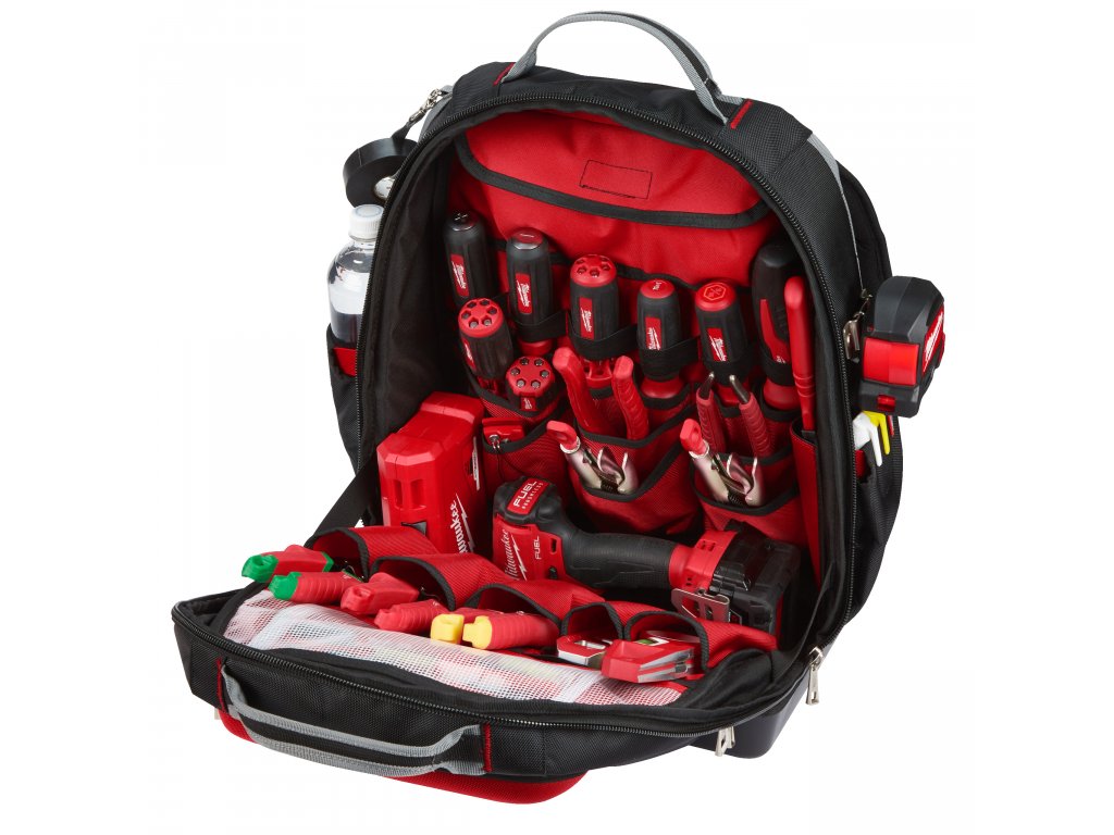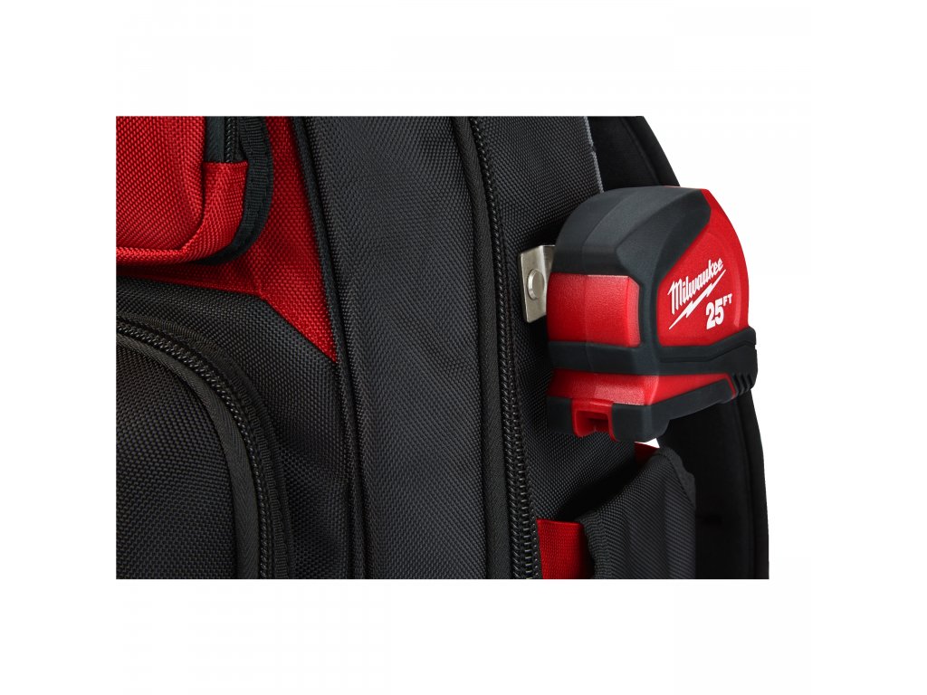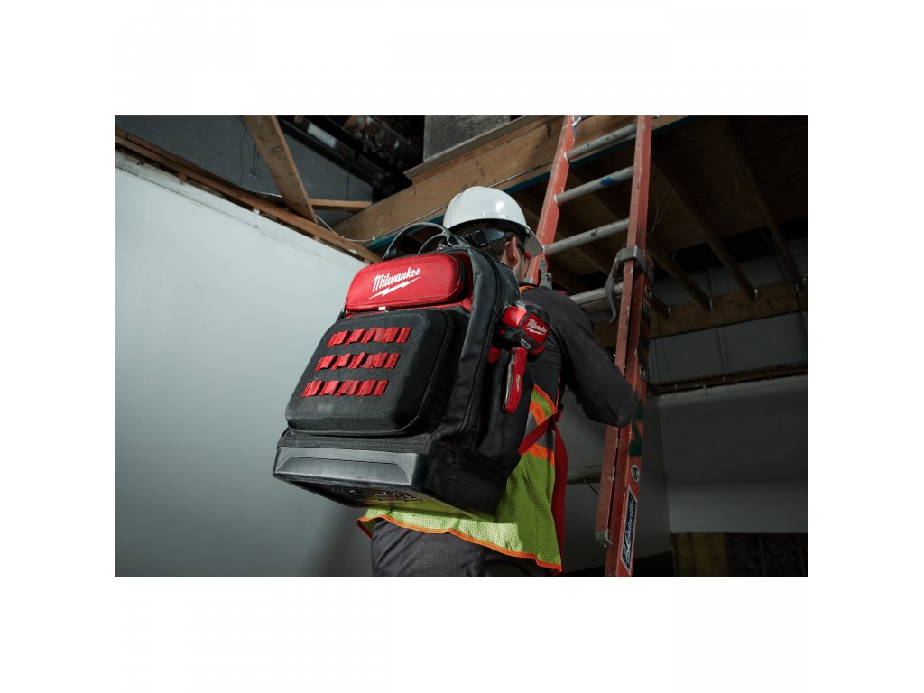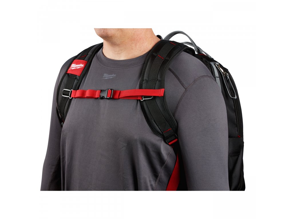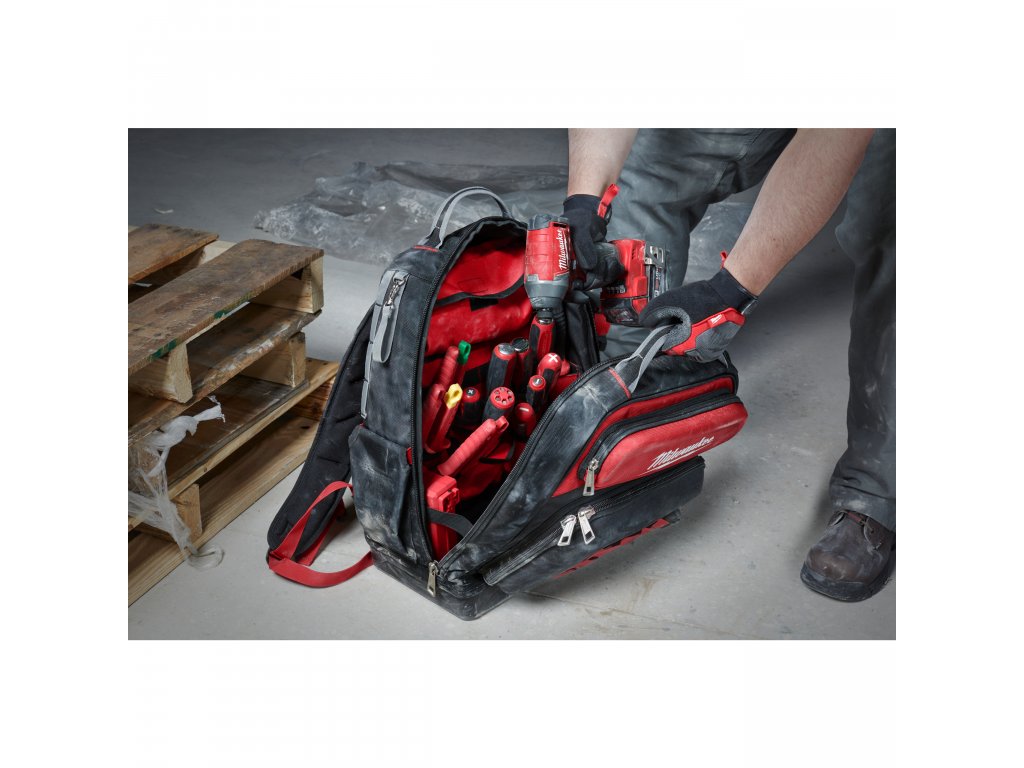 Batoh Premium Milwaukee je vyroben z balistického materiálu 1680D a je opatřen robustními kovovými zipy, které zajišťují větší odolnost.- Pevná tvarovaná základna umožňuje postavení batohu a omezuje vnikání nečistot a vody.