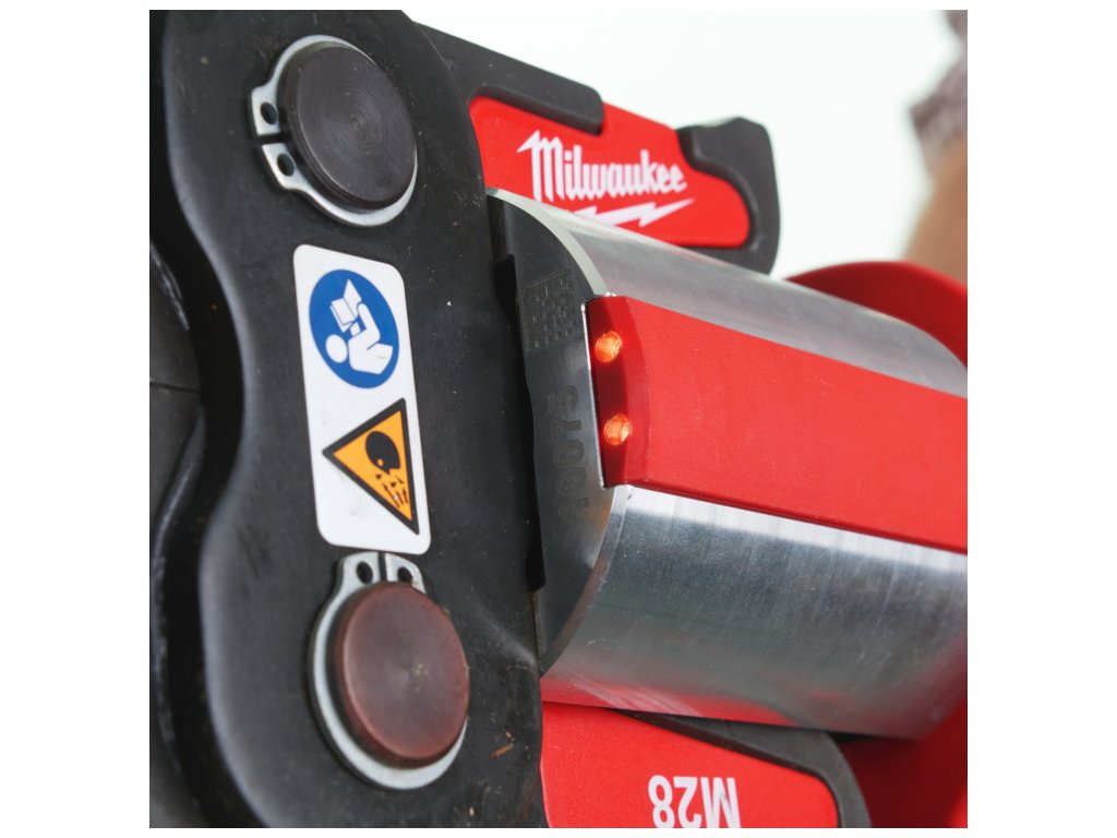 - Komunikace akumulátoru a nářadí: v případě nízké hladiny nabití lisovací cyklus nezačne. Kontrola akumulátoru před lisováním zajišťuje, aby každý lisovací cyklus byl úplně dokončen.