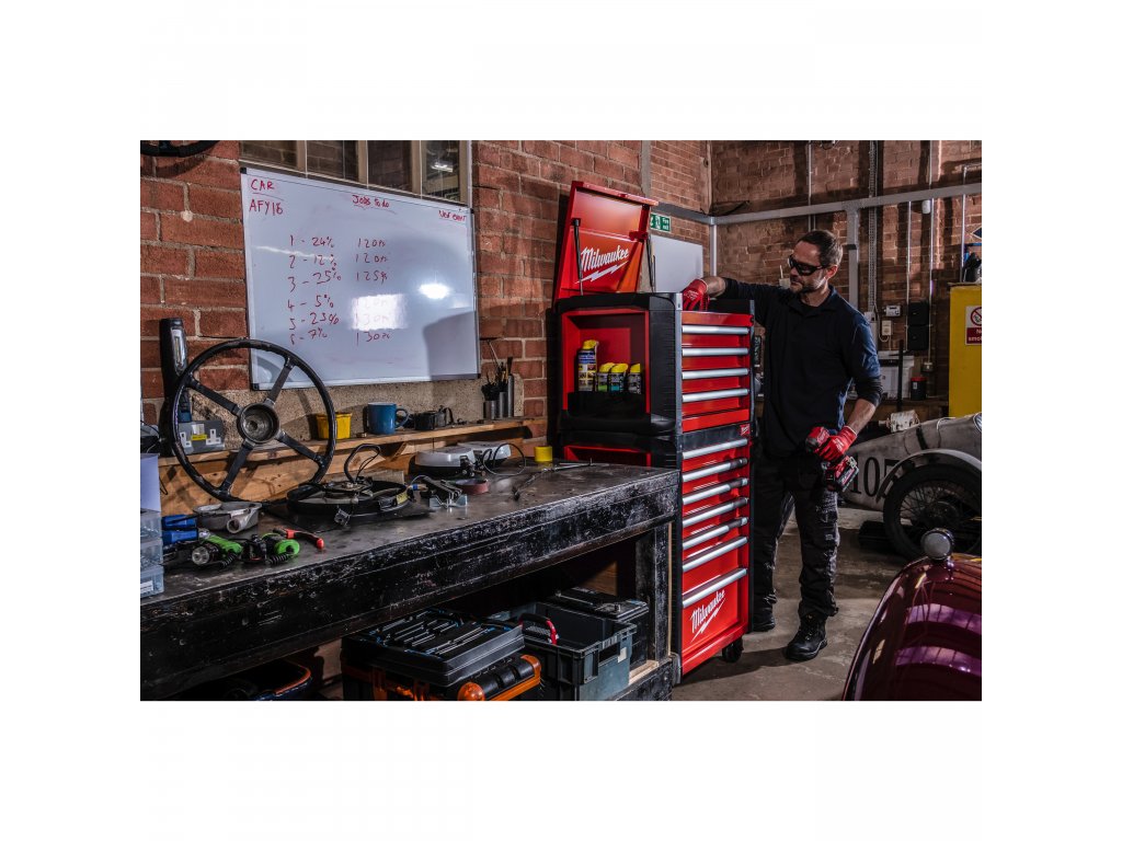Horní nástavba na dílenskou skříň Milwaukee se 4 zásuvkami s měkkým dorazem dimenzované na 45 kg.- Ochrana proti překlopení umožňuje otevření pouze 1 zásuvky najednou.