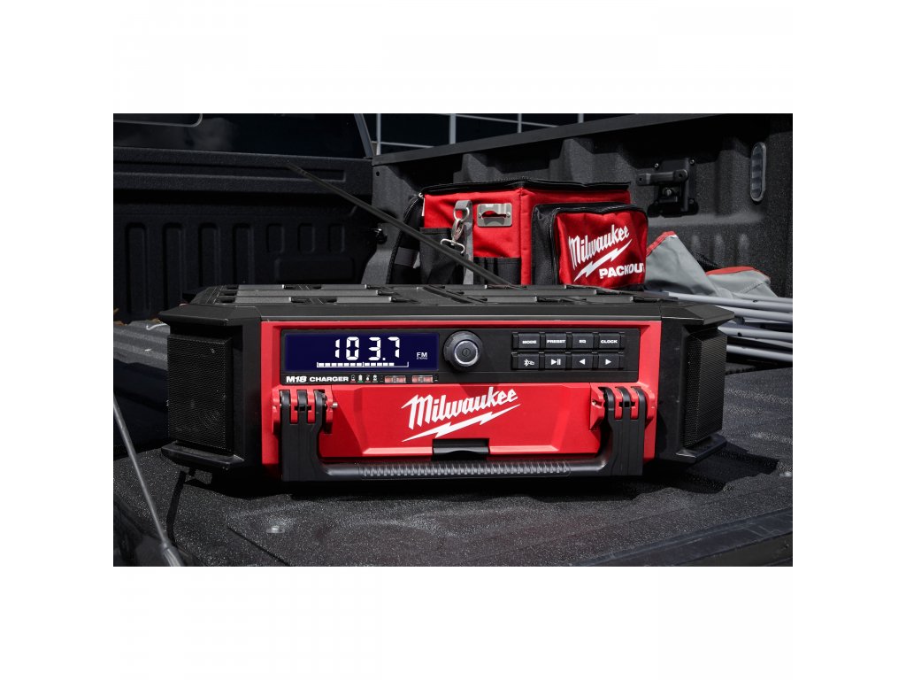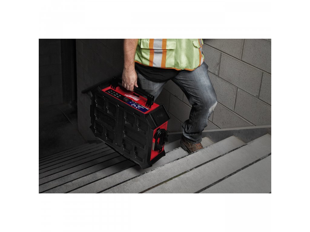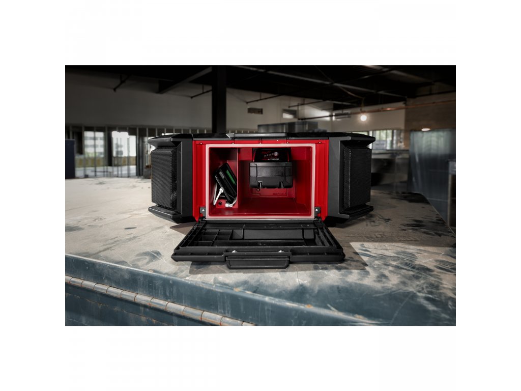 MILWAUKEE Packout stavební rádio M18 PRCDAB+-0 s prémiovým reproduktorem s 360° prostorovým zvukem a 40 W zesilovač produkují bohatý a plný zvuk.- DAB + a FM/AM s digitálním procesorem poskytuje nejvyšší přesnost příjmu, čistotu signálu a další informace jako: skladba, umělec a přesný čas
