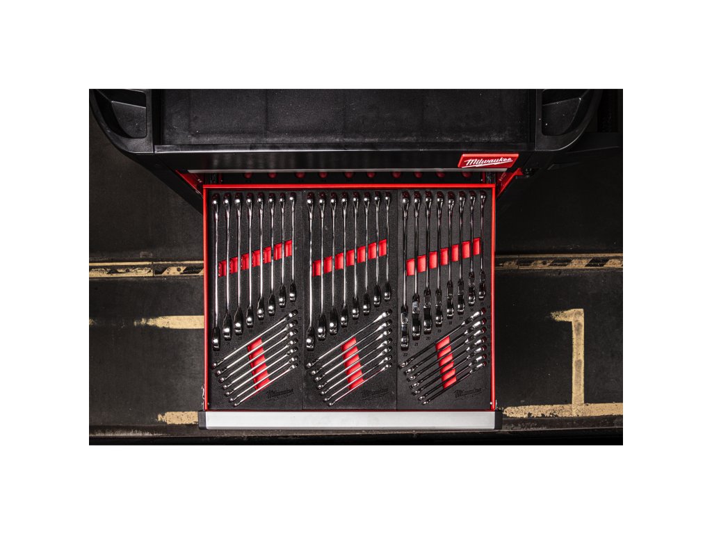 Pěnová vložka se sadou ráčnových klíčů s kloubovou hlavou Milwaukee MAX BITE s hlavou otočnou na 180° pro lepší přístup do stísněných míst.- Rukojeť s otevřeným klíčem MAX BITE™ omezuje zaoblení a prokluzování.