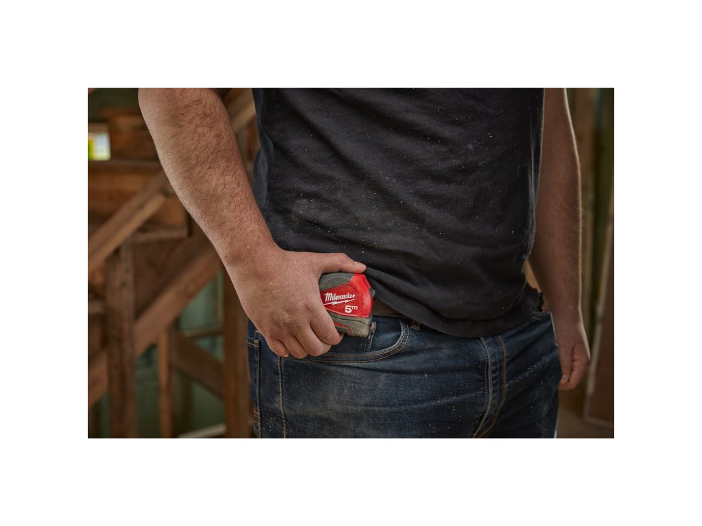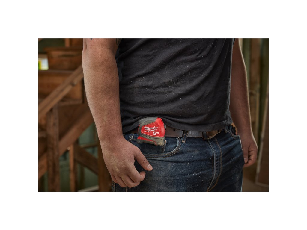 Měřící pásmo / Svinovací metr Milwaukee 5 m o tloušťce 25 mm se zlepšenou ergonomií a pohodlnou velikostí.- Odolnost na pracovišti