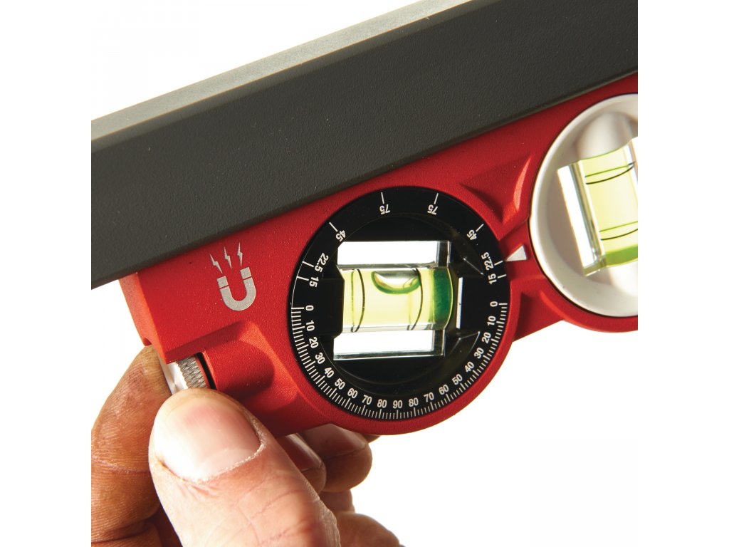 - 360° nastavitelná libela s možnosti uzamčení. Identifikuje a opakuje nastavení jakéhokoliv úhlu potřebného na pracovišti. Libela se uzamkne kvůli zajištění přesnosti měření, klidně i po vyjmutí z kapsy.