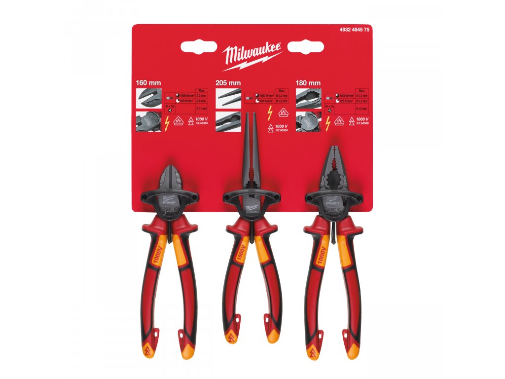 Sada 3 profesionálních izolovaných kleští Milwaukee. Testováno pod napětím 10 000 V, certifikát do 1 000V.- Kovaná a kalená hlavice s titanovou vrstvou, která zajišťuje maximální odolnost proti korozi.