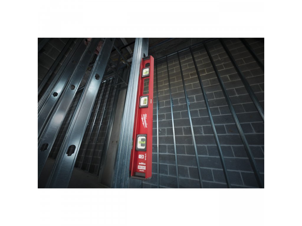 Lehká vodováha Milwaukee s vyztuženou hliníkovou konstrukcí a magnetickou hranou, která umožňuje uvolnění rukou při práci s kovy.- Přesnost až do 0,029° (0,0005 ?/in, 0,5 mm/ m) v normální i obrácené poloze.