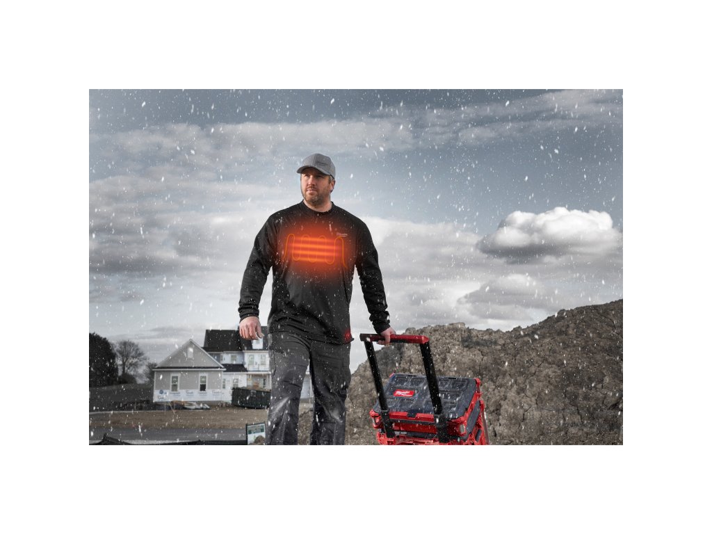Vyhřívané tričko Milwaukee s konstrukcí střední hmotnosti z trvanlivého materiálu odolného proti vytváření žmolků udržuje tělo v teple a suchu.- Úplné vyhřátí do 2,5 minuty